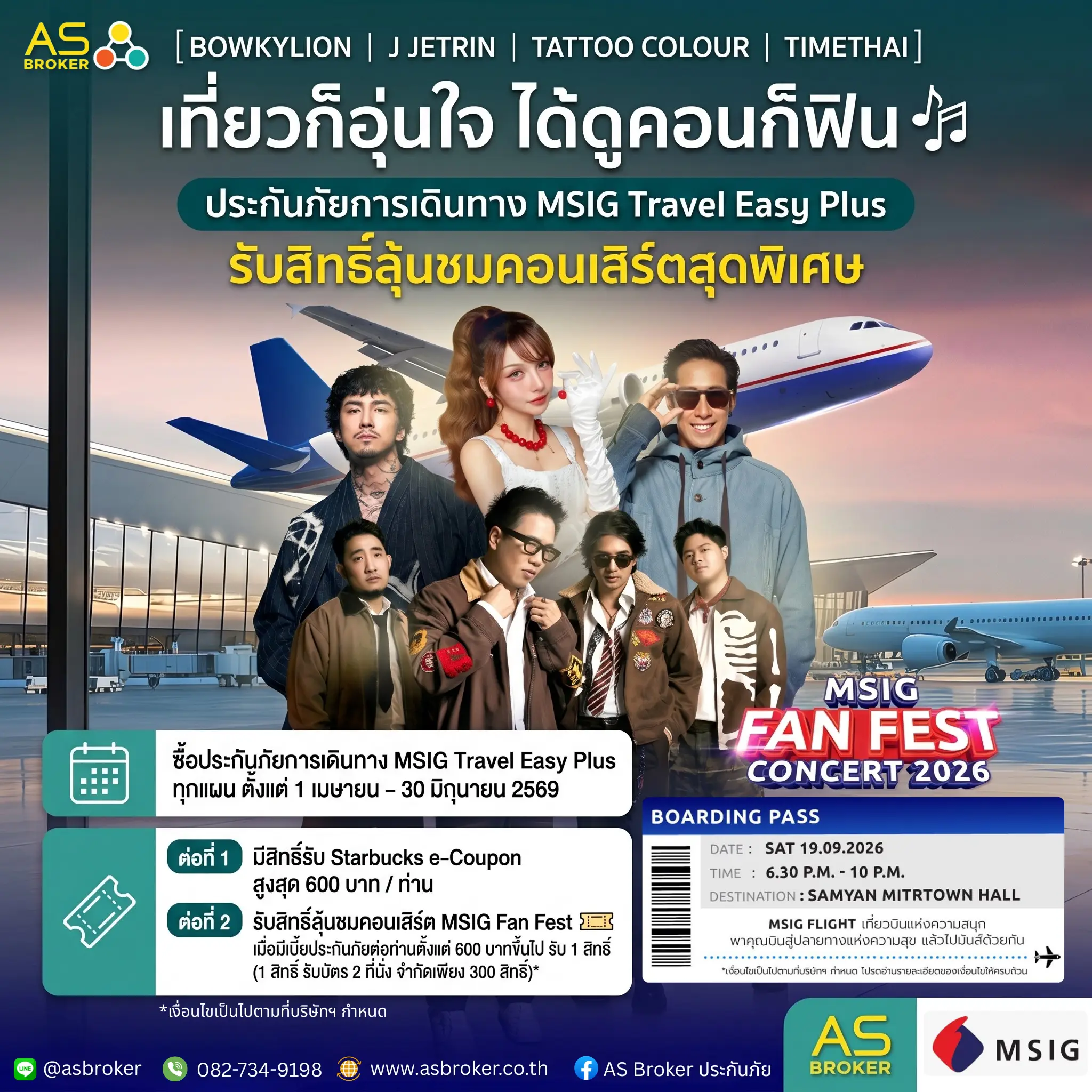 AS Broker ขอชวนคุณเพิ่มความคุ้มครองให้ทุกการเดินทาง กับ ประกันภัยการเดินทาง MSIG Travel Easy Plus พร้อมรับสิทธิพิเศษสุดคุ้ม ทั้งของรางวัลและสิทธิ์ลุ้นชมคอนเสิร์ตสุดพิเศษ